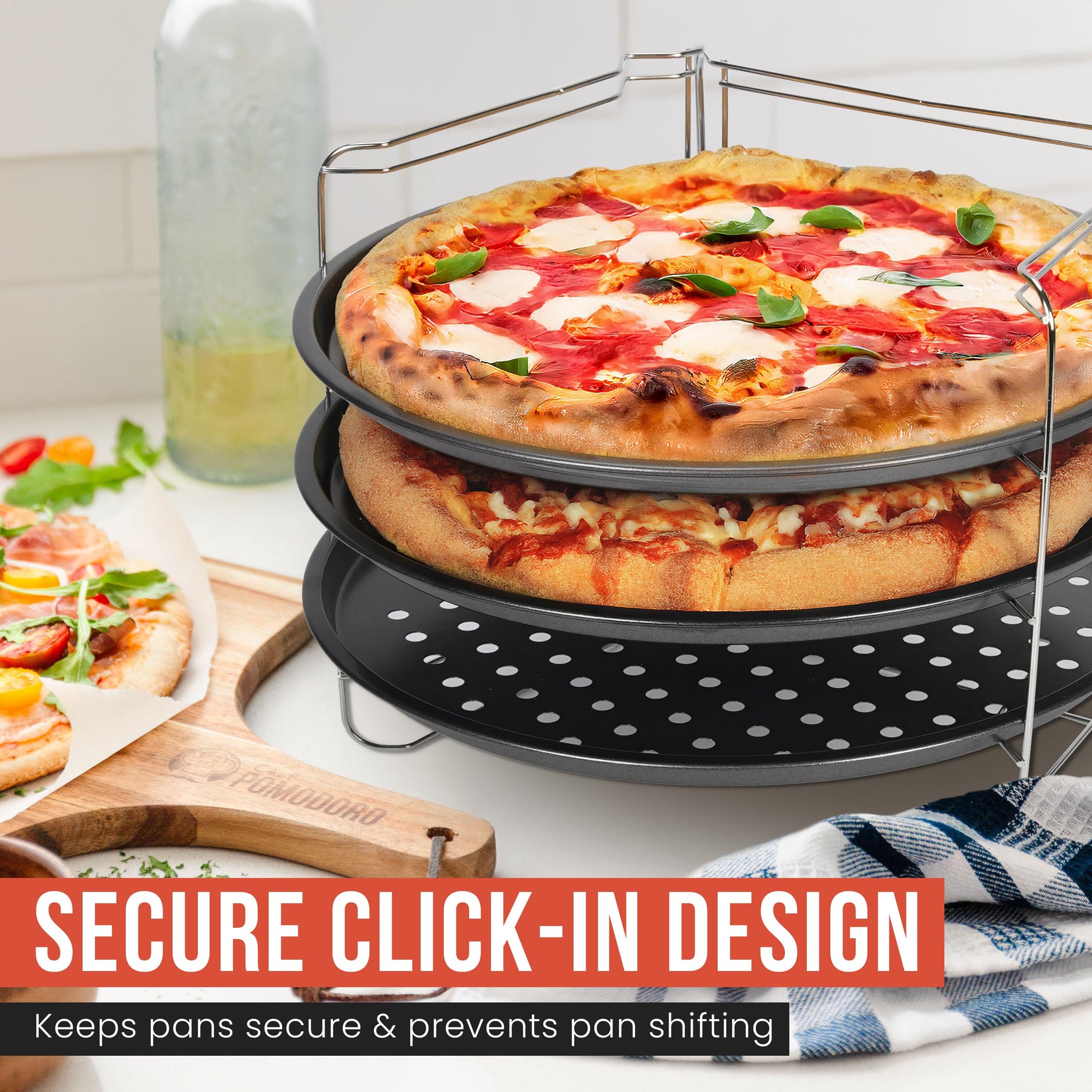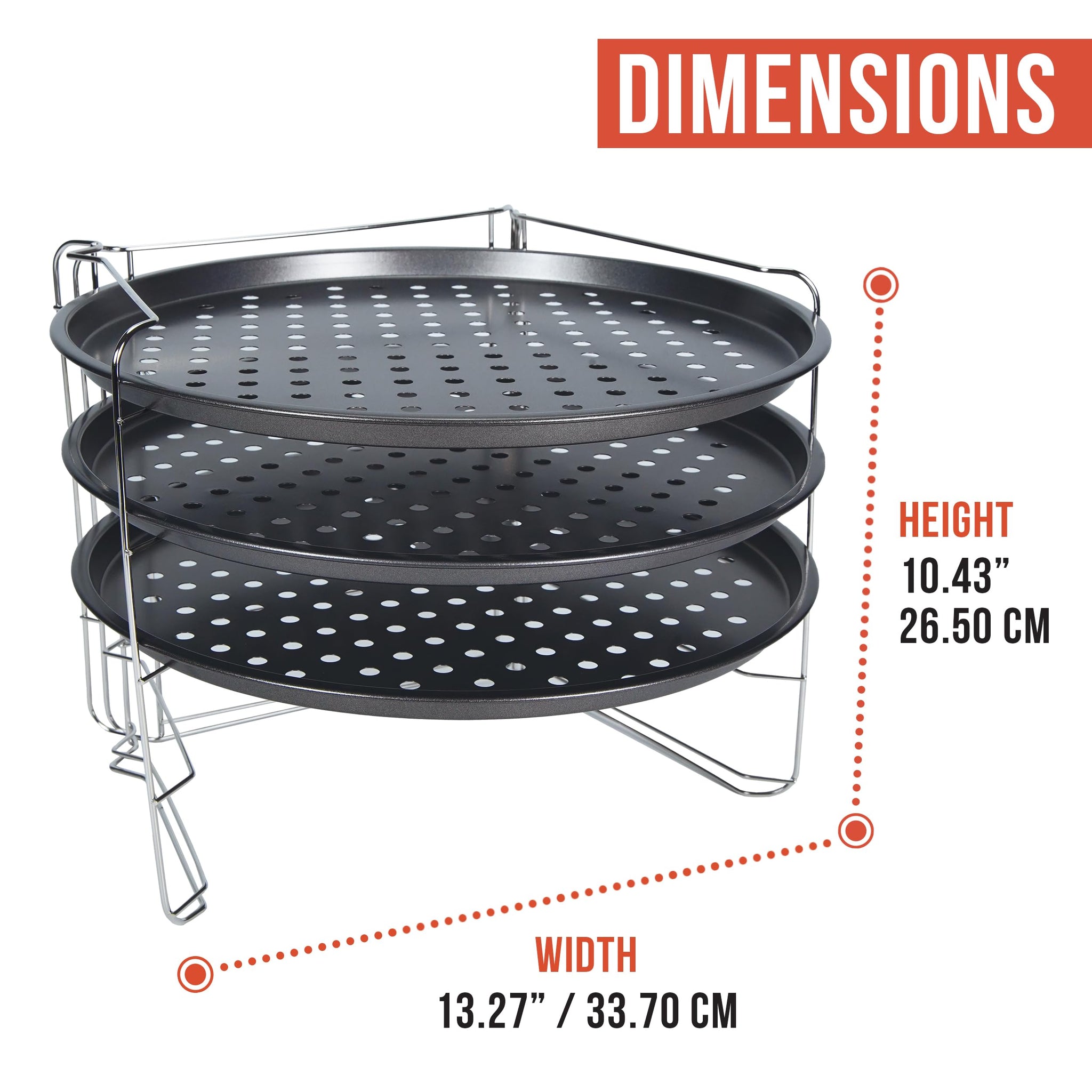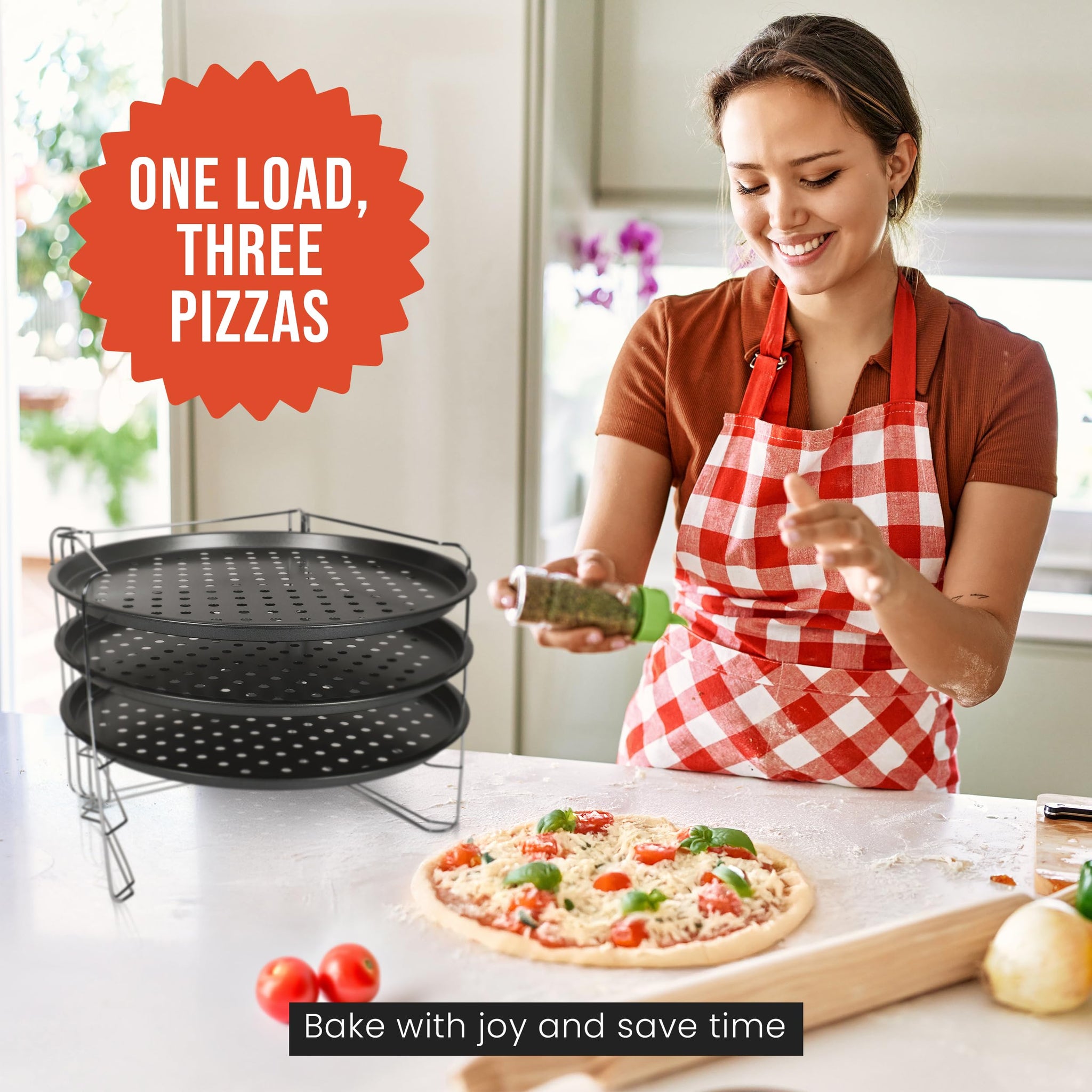 - THREE PERFORATED 13-INCH PANS: Each plate can be used to cook up to 13-inch pizzas. Easily bake frozen pizzas, or mix it up with other snacks such as frozen fries or sweet pies. Each carbon steel pans distribute heat evenly and can withstand oven temperatures of 450°F. With perforated holes, heat also cooks the underbelly of the foods of each layer as it rises.