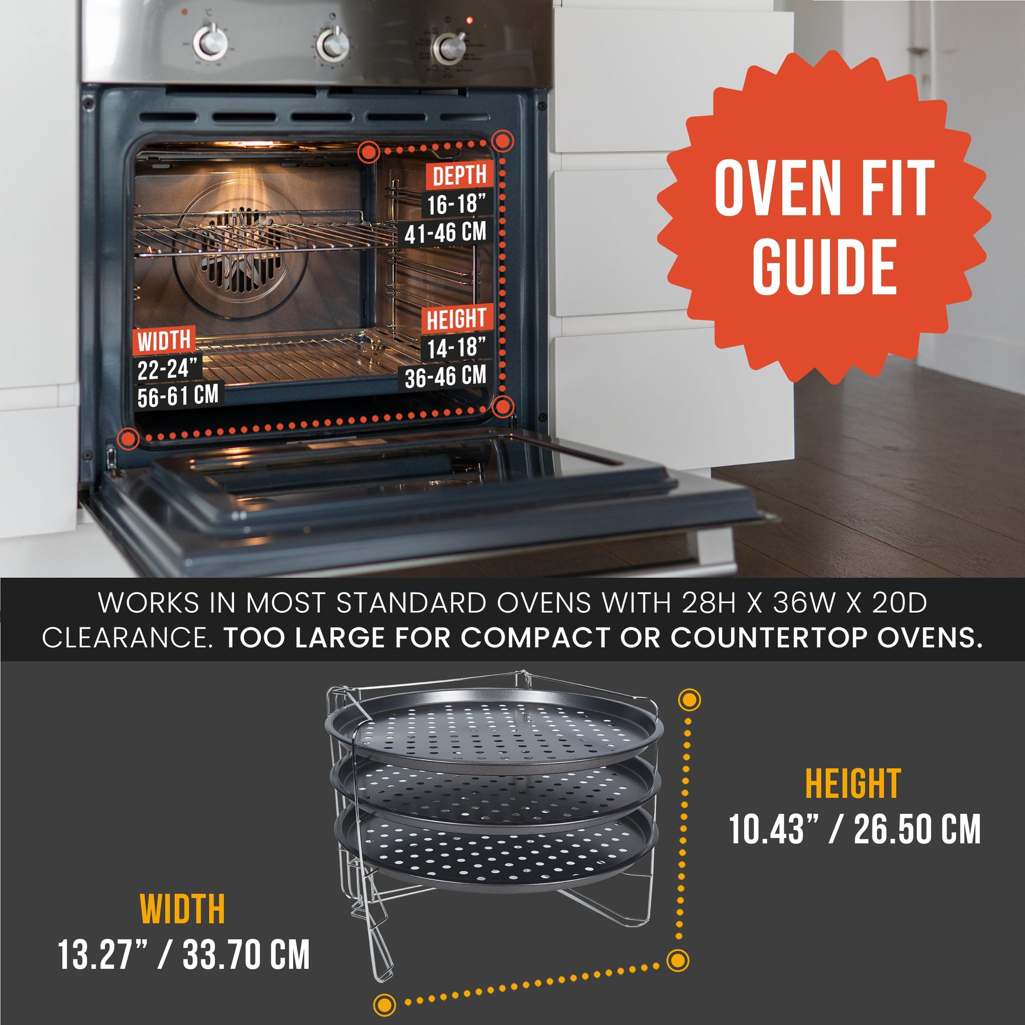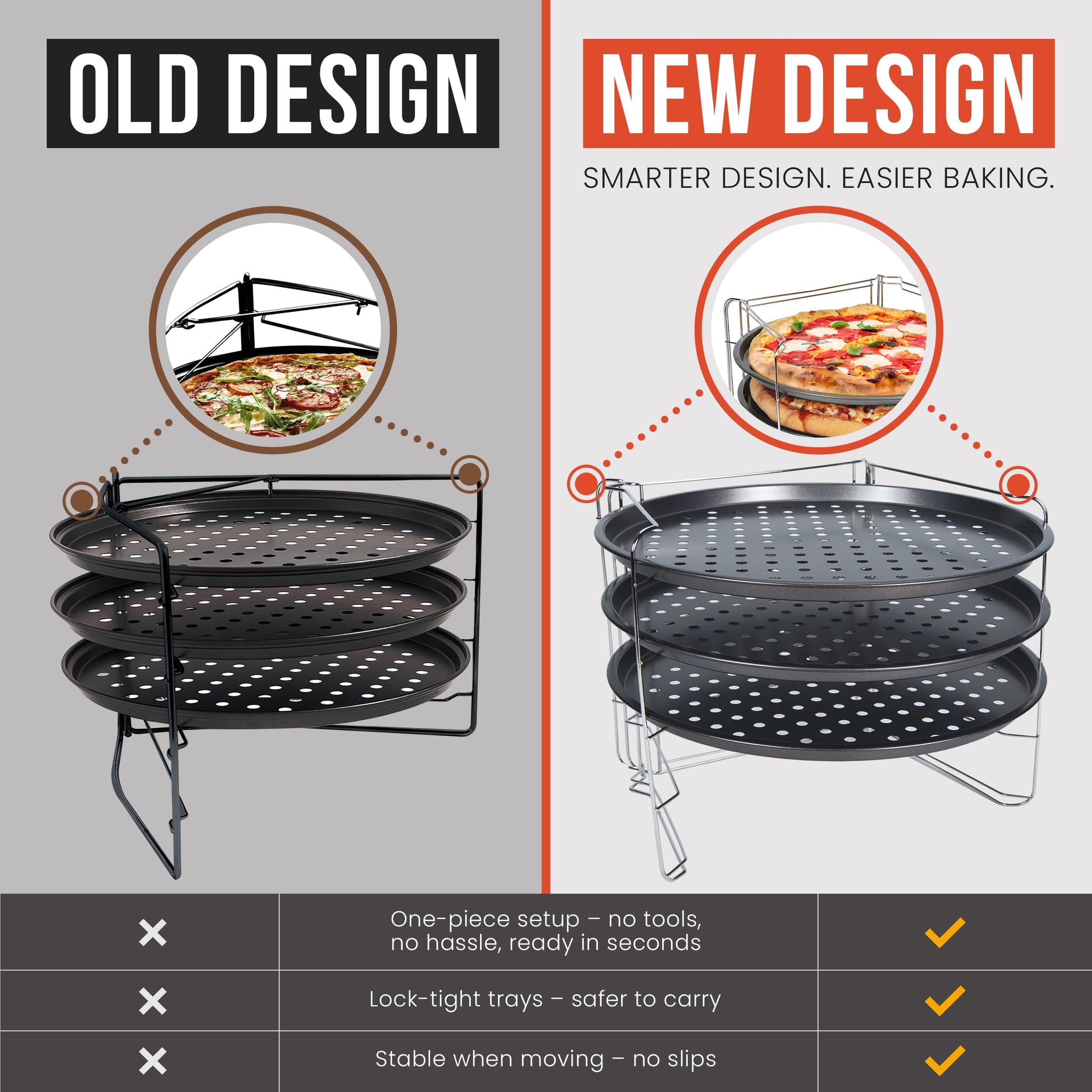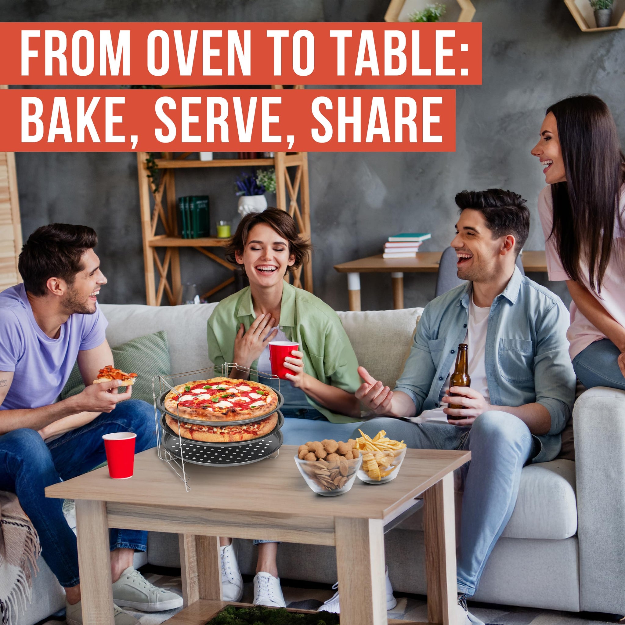 - THREE PERFORATED 13-INCH PANS: Each plate can be used to cook up to 13-inch pizzas. Easily bake frozen pizzas, or mix it up with other snacks such as frozen fries or sweet pies. Each carbon steel pans distribute heat evenly and can withstand oven temperatures of 450°F. With perforated holes, heat also cooks the underbelly of the foods of each layer as it rises.
