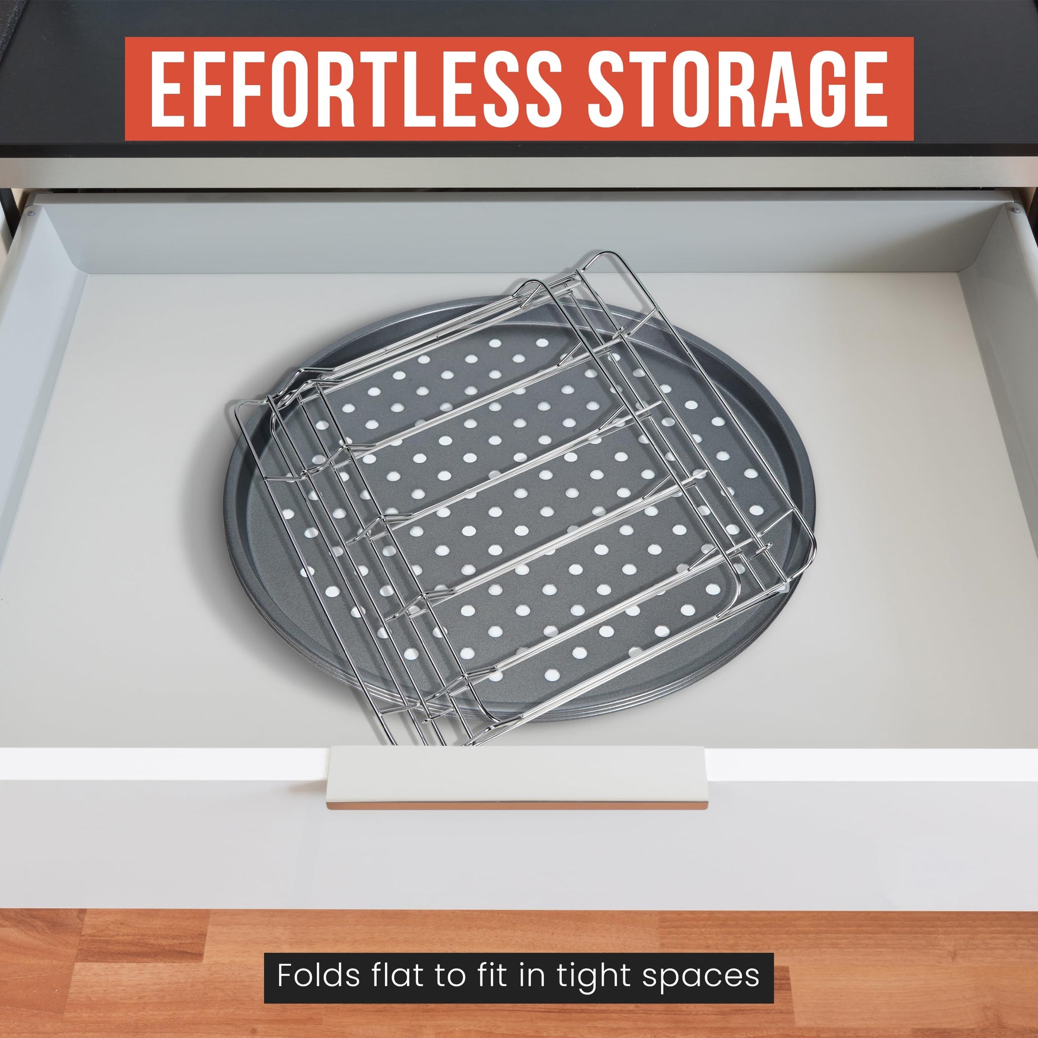 Chef Pomodoro’s 4-Piece Pizza Rack is made for convenience! Prep and cook a variety of foods at the SAME time in the oven. Designed with convenience and practicality in mind, the perforated pizza pans distribute heat evenly while the perforated holes allow heat to cook the underbelly so each layer cooks at the same time.