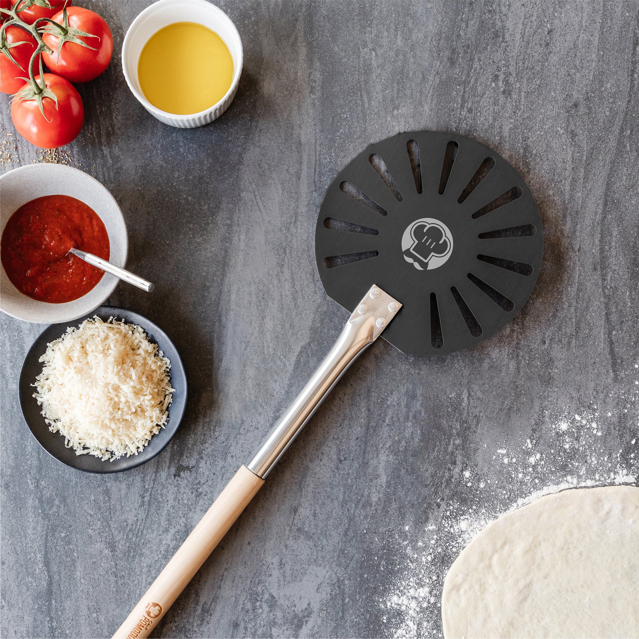 - EASY HANDLING: Chef Pomodoro’s 9” Aluminum Turning Peel is designed for easy maneuvering and rotating your pizza in a scorching hot oven. Featuring a hard anodized aluminum head and detachable 47” wooden handle, the peel can handle both home pizza ovens and commercial sized ovens. Get the peel designed by and for professionals.